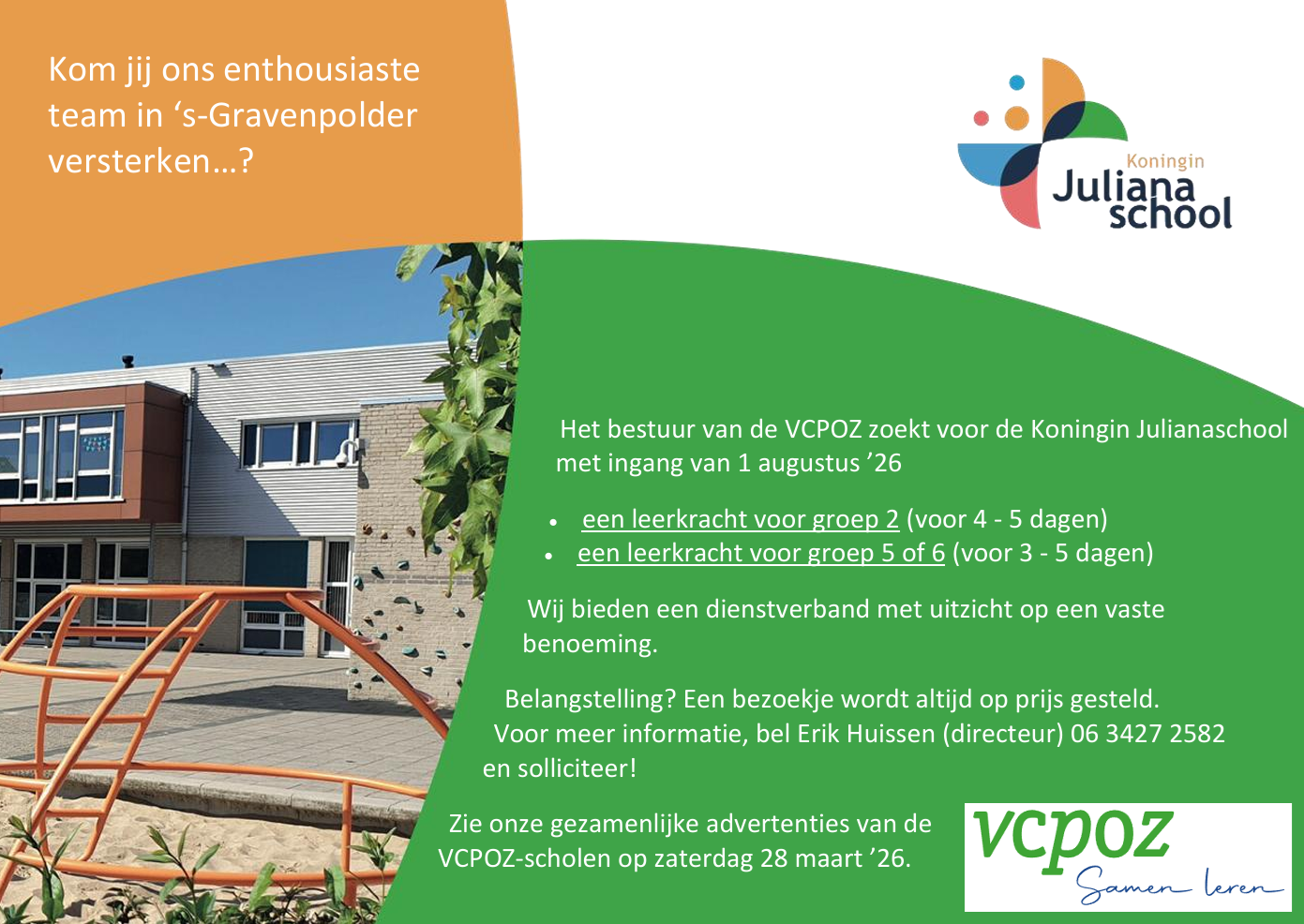 Bij ons op school zijn er vacatures voor diverse groepen ontstaan. De verschillende vacatures ziet u hieronder in de advertentie. Heeft u interesse om ons team te komen versterken, dan vindt u meer informatie via de buttons hieronder.